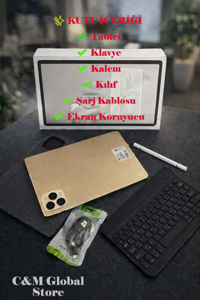 Tablet 17 Pro Max tablet 11 inç ekran, 16GB RAM, 1TB hafıza, Android 15 ve 5G desteğiyle güçlü performans sunar. 12000mAh batarya, klavyeli kutu içeriği.